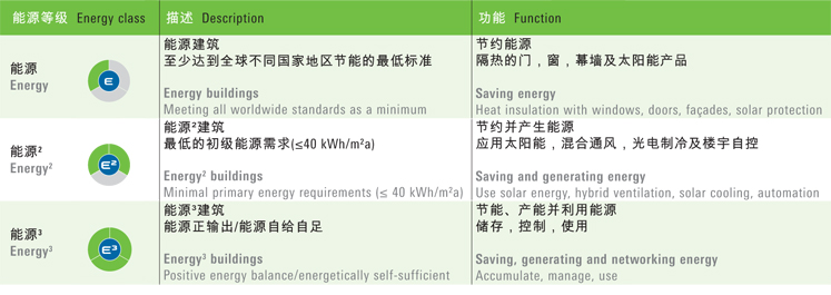 2.旭格能源等级提供解决方案,满足能源需求节能、产能并利用能源展示了旭格能源建筑的三个重要效应。通过旭格系统解决方案使建筑自身满足所有气候特征地区的不同能效标准。为此,旭格明确定义了能源等极标准。旭格系列产品成功体现了节能建筑的要求:从目前可实现的节能水平到未来理想中的能量正输出。旭格公司能源、 能源²和能源³概念明确,简单,直接地阐述了全球各地对建筑节能的需求及期望。