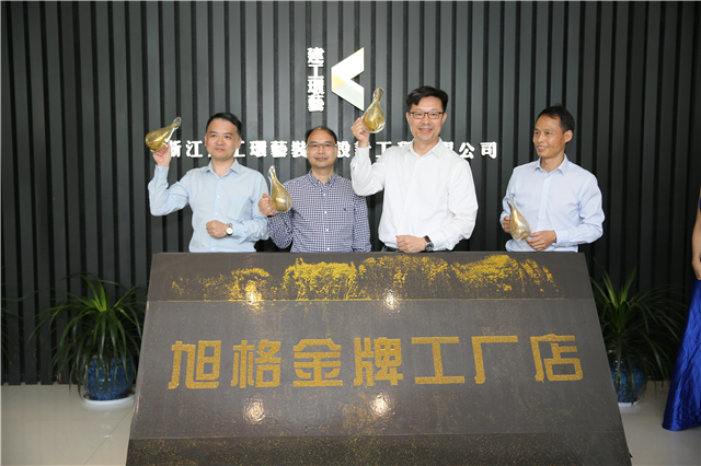 最后,我司张总同李彤先生,唯家住宅总经理,华东二区总监,共同为旭格金牌工厂店开放日进行启动仪式,金沙缓缓流下,呈现出“旭格金牌工厂店”,也预示着旭格金牌工厂店开放日启动仪式圆满成功,来宾共贺!