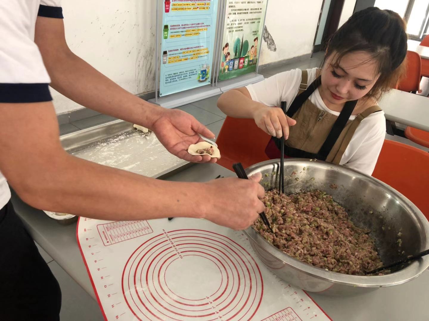 9月13日上午,员工食堂内人声鼎沸,飘香四溢。公司组织开展的“包饺子,话团圆”的中秋活动正在热火朝天的进行中。食堂工作人员已经提前备好了馅料、面粉、工具,充分做好各项准备工作。看看我们的馅料,有芹菜香菇猪肉馅,韭菜猪肉馅,还有最后临时加的鸡蛋韭菜馅。大厨自己剁的猪肉馅,配上新鲜的蔬菜,想不好吃都难。