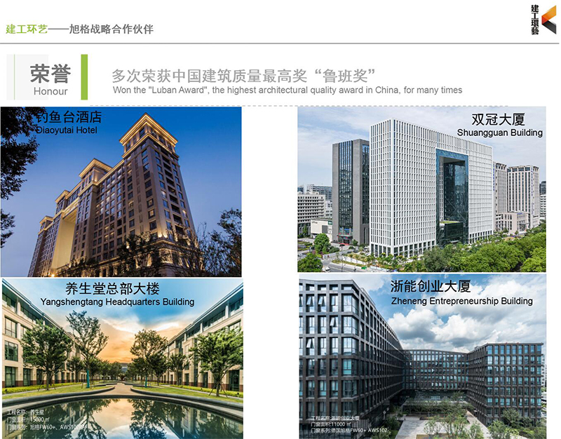 在旭格团队的长期密切支持下,我司已承接超过100个旭格工程项目。幕墙门窗面积超过120万㎡。浙能创业大厦、双冠大厦等多个项目荣获“鲁班奖”,希望经过共同持续努力,可以服务更多客户,为客户带来更好的体验和价值。