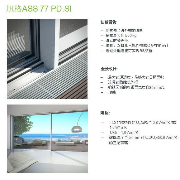 旭格ASS 77 PD.SI推拉系统的全景设计以最小的型材轮廓可视面宽度及隐藏式外框墙体连接技术而独树一帜。除设计之外,该系统Uw值<0.8W/m²K,隔热性能出众,系统具备很高的兼容性。隐藏于型材中的电动驱动及锁闭技术使用户享受最大程度的操作舒适度。